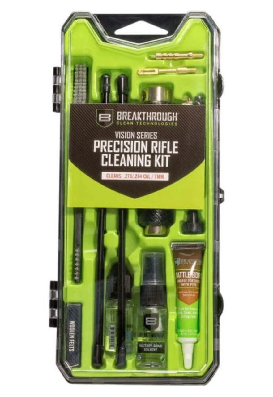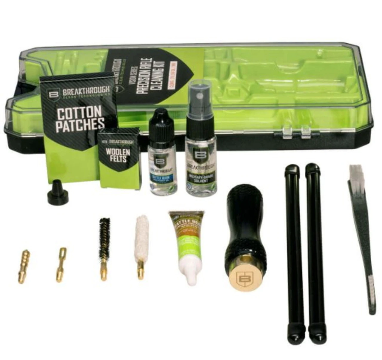 These cleaning kits come with cleaning rod sections, various hard bristle nylon brushes, jags, patch holders, and cotton patches. Also included is our durable and detachable aluminum handle with knurling for an easy grip and our mini bottles of Breakthrough Military-Grade Solvent and Battle Born High-Purity Oil.