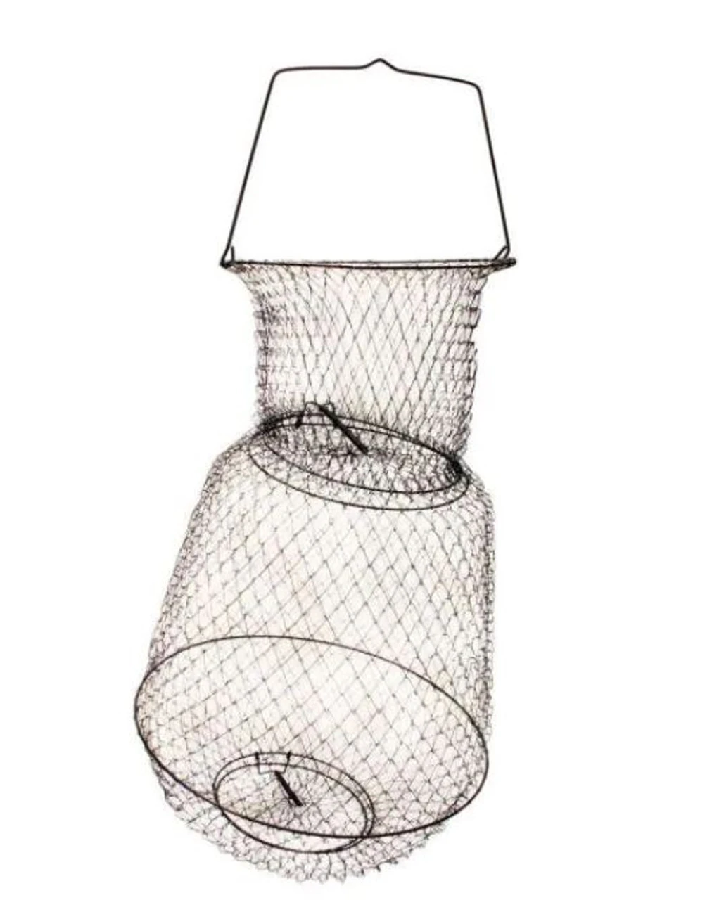 Collapsible wire basket features spring loaded trap doors both on top and bottom for easy loading and unloading. Constructed of 5/8 in. anodized wire mesh with bottom reinforced ring and sturdy wire handles. Black in color.