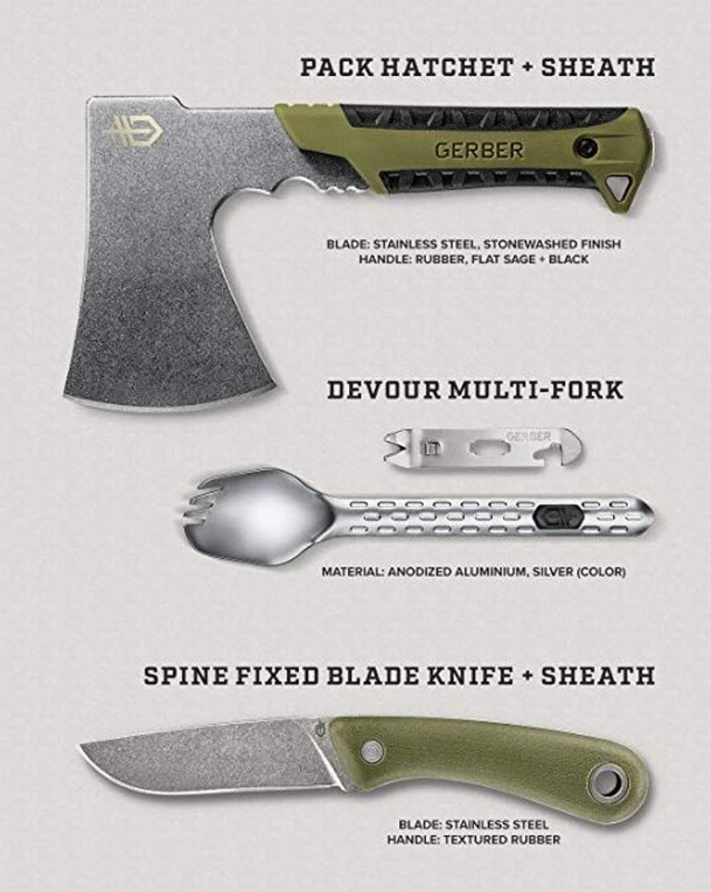 The Gerber Pack Hatchet/Spine/Devour Combo is a compact tool that delivers an impressive amount of function. The Pack Hatchet features exaggerated finger grooves in the handle that allows for incredible edge control while choking up to handle detail work and precise cuts. The Spine fixed blade brings exactly what is needed, a sturdy, full tang blade, with rubberized grip for all weather conditions, and a rugged glass-filled nylon sheath for safe storage and transport. The Devour us a 9 function tool needed for cooking, eating, and cleaning. The lightweight combo snaps together for secure portability, yet each tool works independently.