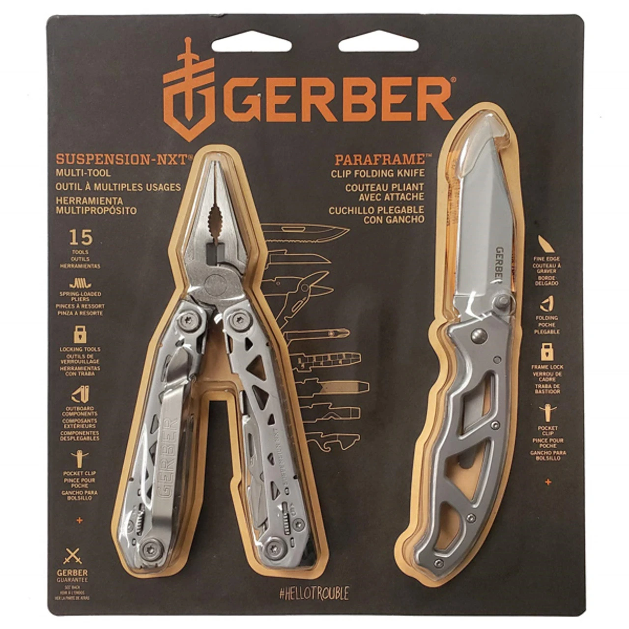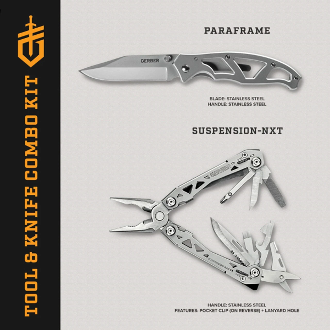 The Gerber Tool and Knife Combo is the essential kit for day to day tasks. It includes the new Suspension NXT Multi-tool as well as the Paraframe Fine Edge Clip Folding Knife. Both tools are durable, lightweight, and easy to transport which makes them the perfect companions for everyday carry.
