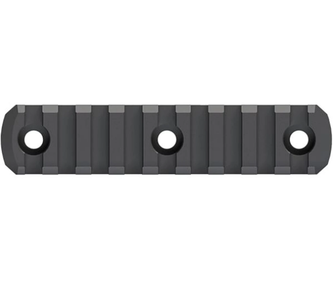 Designed for use with all M-LOK compatible Hand Guards and Forends, M-LOK Polymer Rail Sections provide a cost-effective method of attaching various 1913 Picatinny spec rail-mounted accessories such as lights, vertical grips, etc. Injection molded from a proprietary reinforced composite for enhanced strength and durability while remaining lightweight, Rail Sections also feature beveled ends to reduce snagging and eliminate sharp corners and edges. All hardware necessary for attachment directly to M-LOK Slots on either aluminum or polymer hand guards and forends is included. 9 Slots, max overall length of 4.1 in