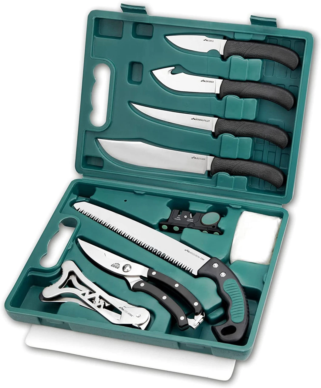 - COMPLETE 11-PIECE FIELD-TO-FREEZER SET: All the tools to process the set like a pro; Includes a cape knife, gut hook peeler, boning knife, butcher knife, wood/bone saw, tungsten carbide sharpener, rib cage spreader, heavy-duty game scissors, cutting mat, and kitchen cleaning gloves games in a hard carrying case.