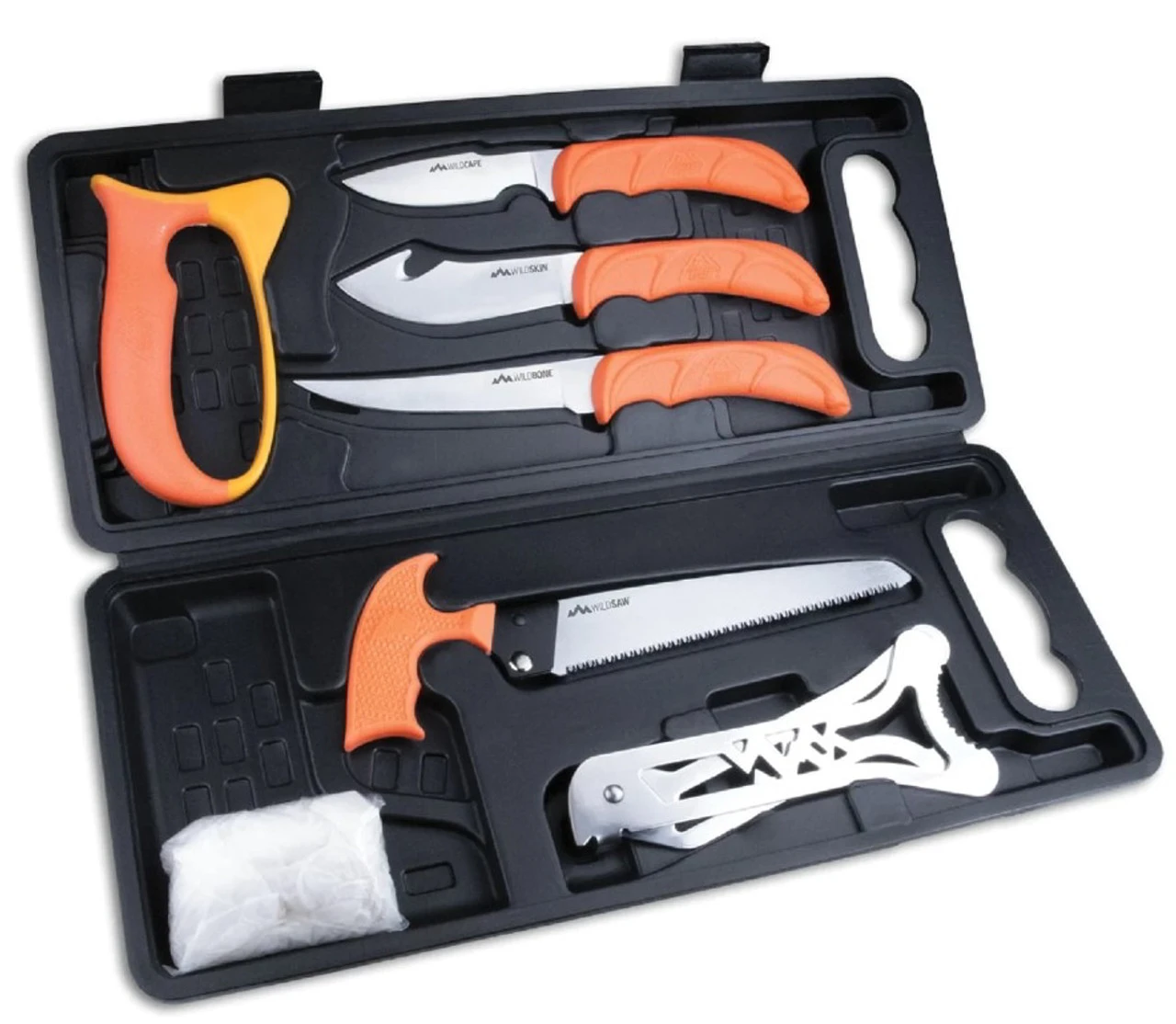 This complete 8-piece, field-to-freezer game processing set with hard-side carry case includes a caping knife, gut-hook skinner, boning/fillet knife, wood/bone saw, ribcage spreader, game cleaning gloves, and a tungsten carbide sharpener to maintain a shaving-sharp cutting edge at all times. The full-tang 420J2 stainless steel knife blades are precisely heat treated, taper ground thin and hand finished shaving-sharp for superior edge retention and performance. Rubberized, blaze-orange TPR handles offer high visibility in the field and ensure a non-slip grip, even when wet. Additionally, the elk horn inlay provides extra indexing points for greater control, and to prevent fatigue during long use. Save the cost of commercial processing and guarantee the quality of the meat for your family with the WildPak.