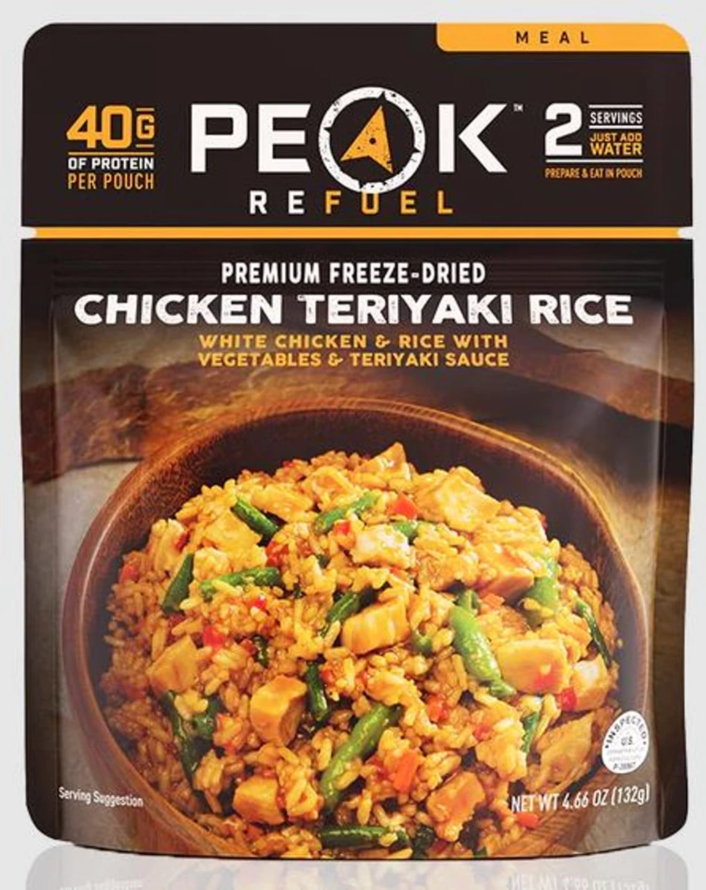 If only takeout delivered to the outdoors…oh wait. Peak Refuels Chicken Teriyaki Rice gives you that flavor you crave while adding 44 grams of protein to your day. Our white chicken breast is chopped and tenderly freeze-dried without any fillers or artificial additives. Now add some fluffy rice, a medley of veggies, and drizzle some teriyaki sauce on top for an Asian-style dinner that you didnâ€t have to call in. Just add 1 ? cups of boiling water and youâ€re ready to roll.