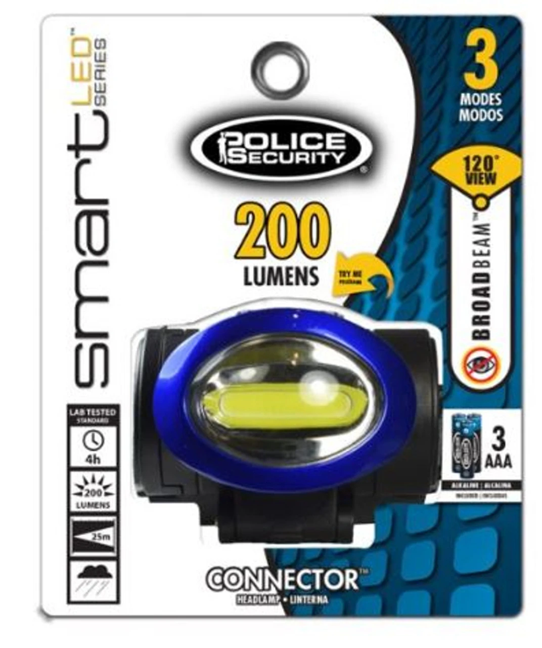 Featuring unique Chip-On-Board (COB) technology, the Connector™ provides a broad 200-lumen beam of light. This quality headlamp features a pivot head, comfort adjust straps, and High, Medium and Flash modes. As a hands-free work light, this headlamp is a great value. Includes 3 AAA Police Security® Alkaline Batteries.