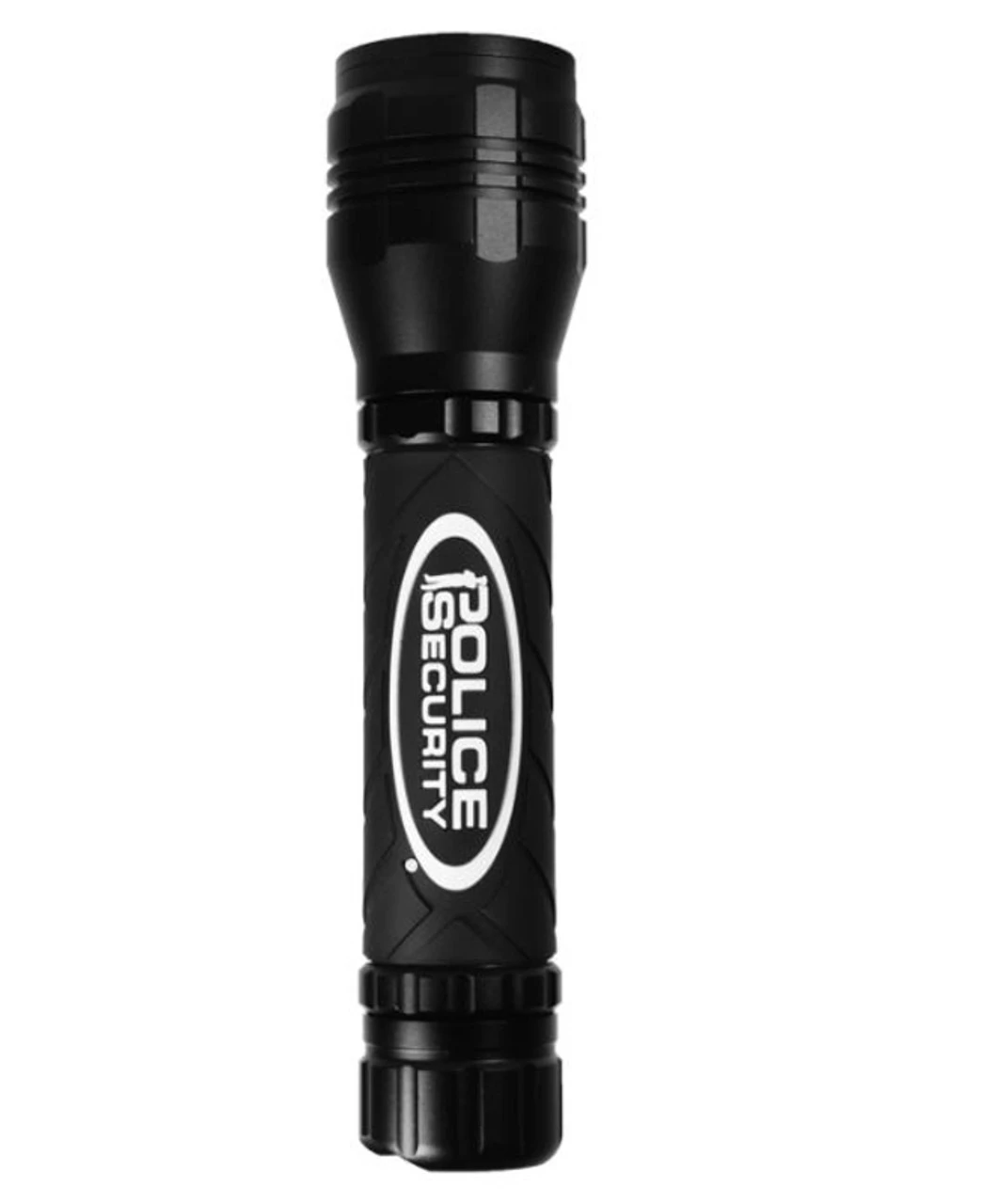Design meets innovation with the Zephyr 9AA flashlight from Police SecurityÂ. The rugged yet sleek body style uses a powerful LED chip driving ultra-bright 1800 lumens of light through Slide Focusing optics. The Zephyrâs Soft Switch technology allows seamless transition through five settings: High, Medium, Low, Flash, and SOS. Includes 9AA Police Security Alkaline Batteries.