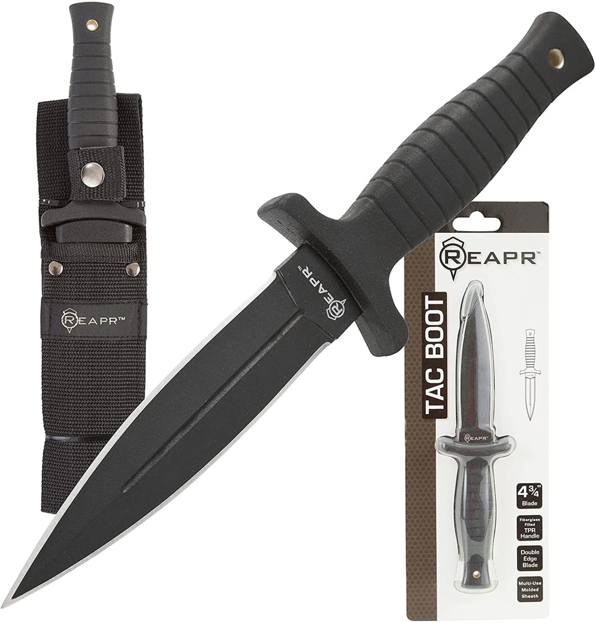 Never be caught in the field without your Reapr 11002 Tac Boot Knife — the ultimate in everyday carry daggers. Designed for covert carry, the Tac Boot delivers, featuring a Nylon-Web sheath with a molded scabbard allowing for boot, belt or over-the-shoulder transport. A 4.75″ black oxide coated 420 stainless steel precision blade features a double edge for maximum utility while a rugged Hi-Grip Fiberglass TPR molded handle offers the best in comfort and optimal cutting leverage. When life calls for a tactical response, take it on with Reapr.