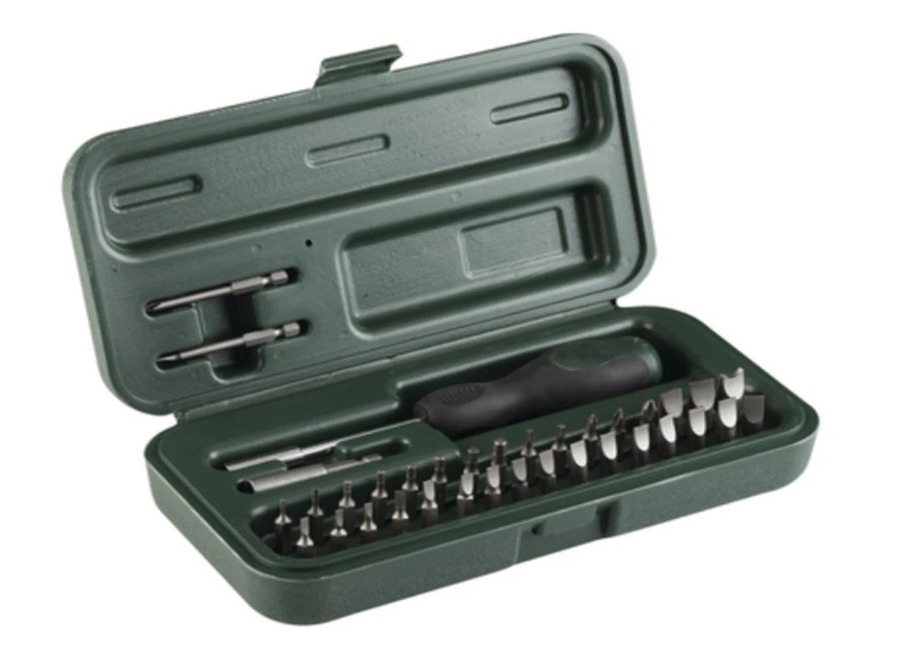 Includes a magnetic tipped hex bit driver and a variety of tool bits to address the most common gunsmith needs.