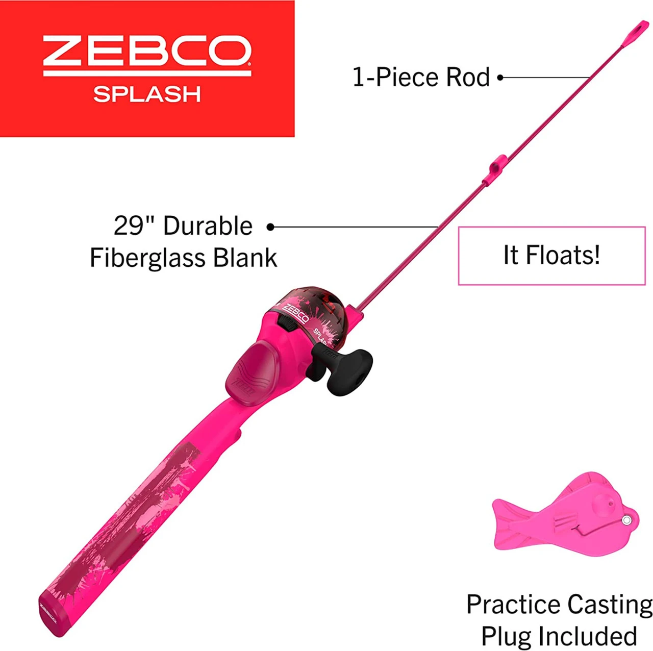 Zebco Pink Splash Kids Spincast Reel And Fishing Rod Combo, 29″ Durable Floating Fiberglass Rod With Tangle-Free Design, Oversized Reel Handle Knob, Pre-Spooled With 6-Pound Zebco Fishing Line