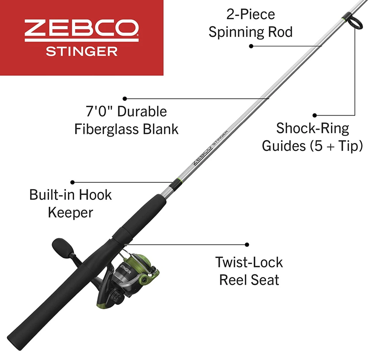 This 7-foot 2-piece fishing rod combo has a sleek design and provides medium power and moderate action making it easier to catch medium species such as walleye and bass.This size 30 spinning fishing reel has durable all-metal gears and a graphite spool that has a mono line capacity of 170/10 yds/lbs. It is conveniently pre-spooled with 10-pound Zebco line and the QuickSet Anti-Reverse stops your reel handle from moving backwards in order to create a solid hookset in the mouth of a fish when reeling in your prized catch.This spinning reel was engineered with a front-adjustable drag that has a max drag of 12 pounds, a 5.3:1 gear ratio, a line retrieval of 28 IPT (inches per turn) along with a changeable right- or left-hand retrieve. The Zebco Stinger is built for style and performance and offers a cool look along with a smooth operation for your next fishing adventure